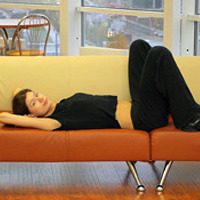 Лягте на бок, обопритесь рукой на подлокотник дивана, медленно поднимайте и опускайте прямую ногу. Упражнение необходимо выполнить в 2 подхода - по 30 раз для каждой ноги. Дышите глубоко.