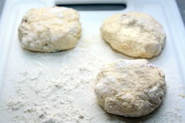 - Теперь начинайте делать сырники. Для этого отделяйте от общей массы кусочки теста и кладите их на припыленную мукой рабочую поверхность. Придавайте им круглую форму и с двух сторон обваливайте в муке. При желании на них можно сделать насечки ножом – для красоты.