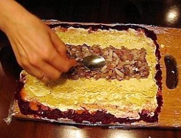 - Теперь осталось сделать рулет сельдь под шубой, завернув его так,
