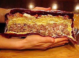 Но самым оригинальным и впечатляющим из них является рулет из этого блюда. Необычный внешний вид сразу же делает его звездой праздничного стола. Так что хозяйки не жалеют сил на такое оформление традиционного салата. Впрочем, если взять на вооружение рецепт с фото на нашей станице, повторить его будет не так и сложно.