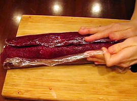 - На пищевую пленку выложите тертую свеклу. Чуть присолите ее,