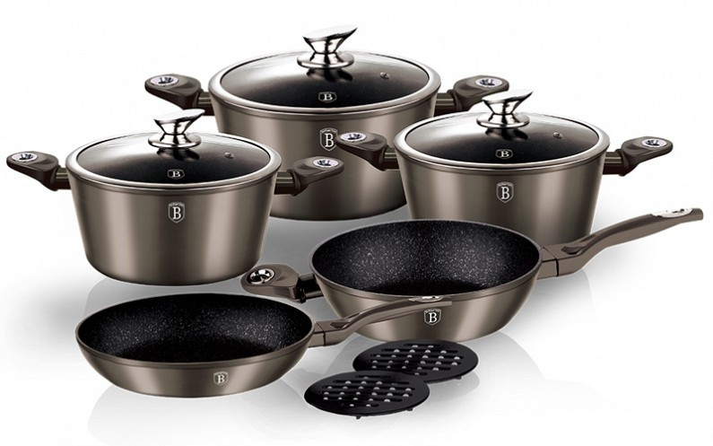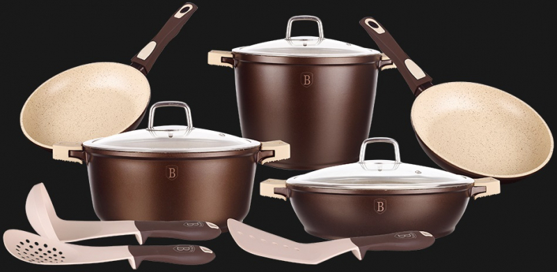 BerlingerHaus – это фирма нового поколения. Наборы посуды Berlinger Haus завоевали рынок благодаря использованию популярного и современного покрытия– мраморного. Трехслойное мраморное покрытие, слой алюминия и слой стали обеспечивают износостойкость, а отсутствие тяжелых металлов экологическую чистоту посуды.